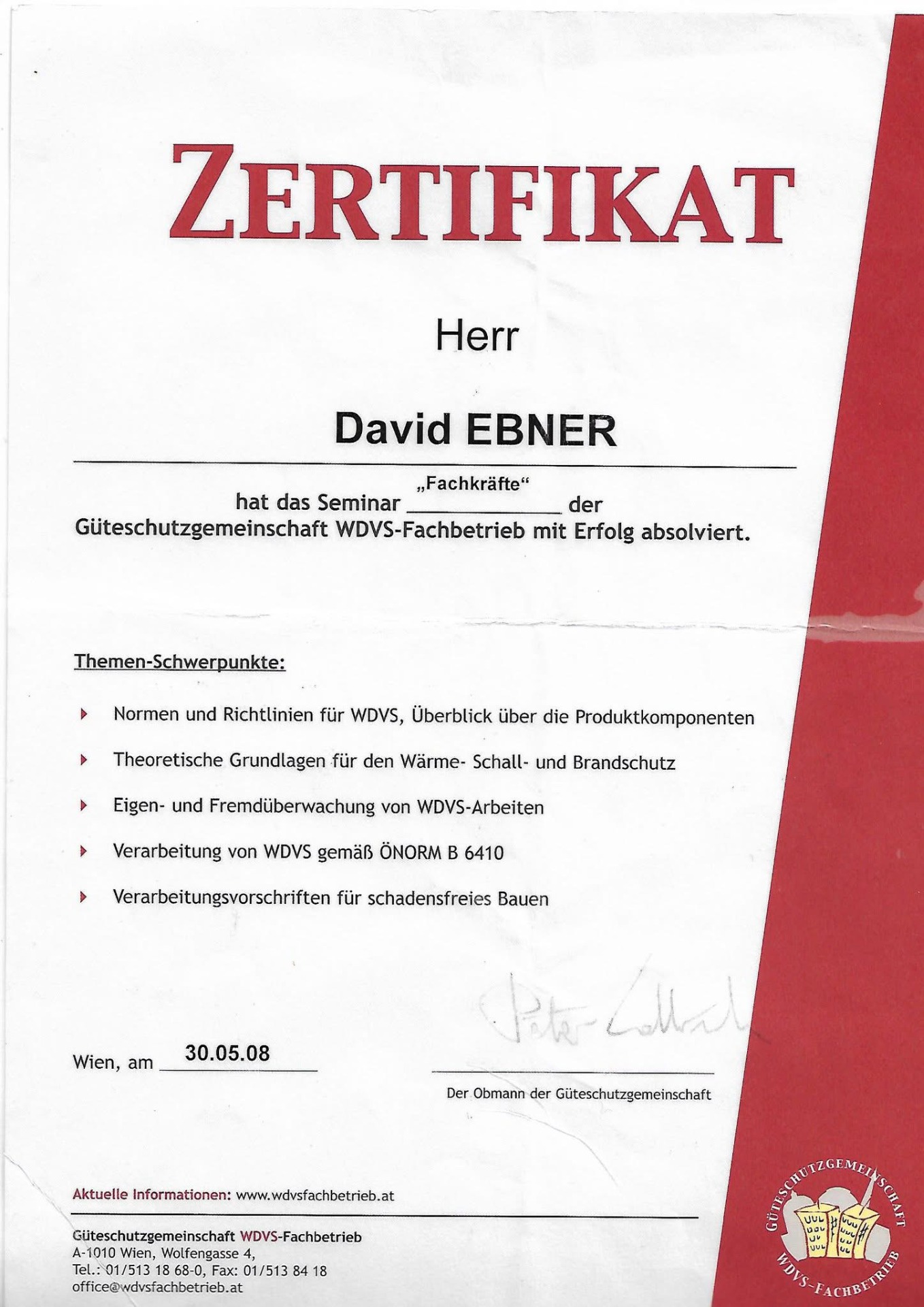 David Ebner úspěšně absolvoval odborný seminář "Fachkräfte" v rámci rakouské Güteschutzgemeinschaft WDVS-Fachbetrieb (Ochranné sdružení odborných firem v oblasti kontaktních zateplovacích systémů – WDVS).